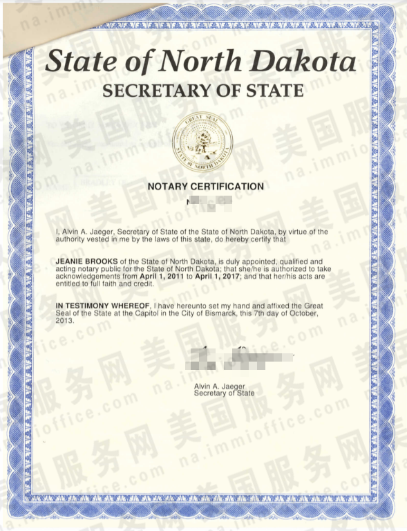 附:美国北达科他州州务卿认证样本