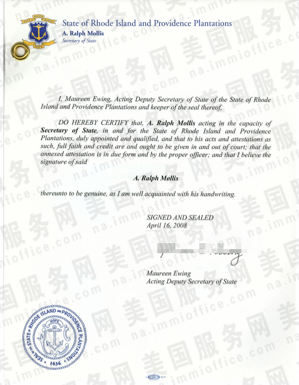 附:美国罗德岛州务卿认证样本